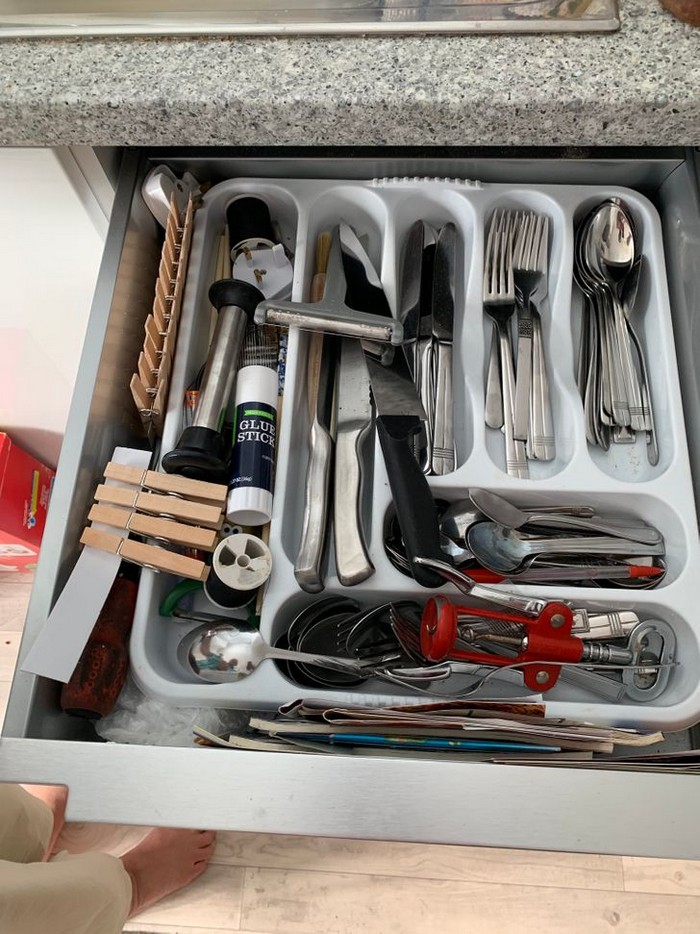 5 – Pregadores de roupas e um bastão de cola na bandeja de talheres
