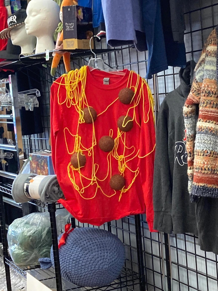3 – Esta blusa te dá fome? Sim, há quem use uma blusa de macarrão com almôndegas