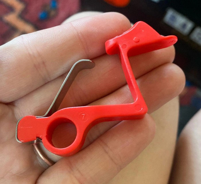 2 – “Uma pequena ferramenta vermelha de plástico e metal, o metal é elástico. Tem um cadeado estampado na extremidade curta e um número 7 estampado no lado plano”