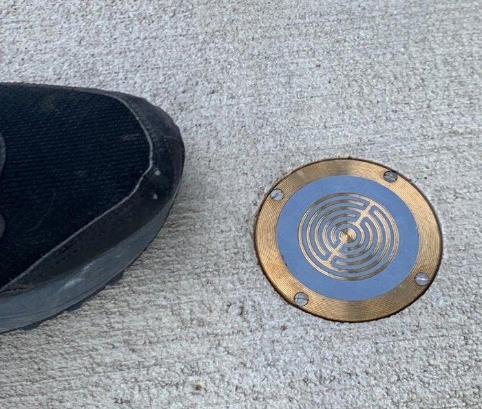 3 – “Uma pequena cobertura na calçada com um padrão de metal, pé para escala”