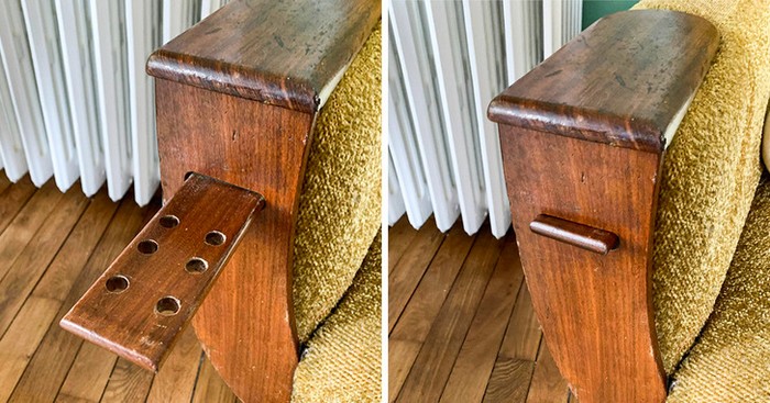 5 – “Uma bandeja deslizante com furos em ambos os lados deste sofá”